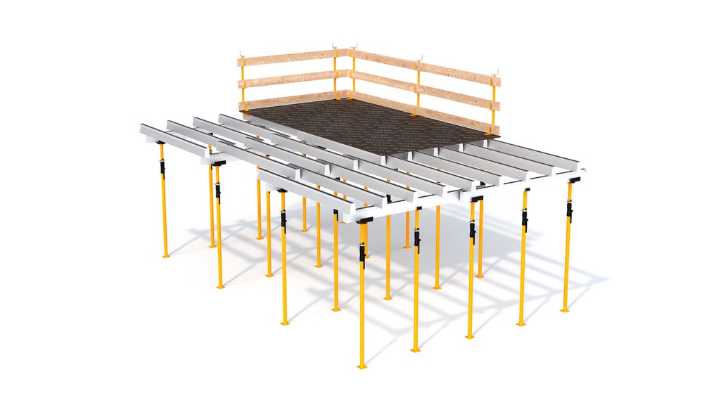 La estructura portante del sistema se forma mediante vigas longitudinales y puntales o cimbras, eliminando la necesidad de reapuntalamiento o desplazamiento de puntales desde el inicio del montaje hasta la retirada completa del encofrado. Los elementos recuperables, como cubetas, tableros, transversales y cabezales, se retiran varios días después del vertido del hormigón para ser reutilizado en una nueva instalación.