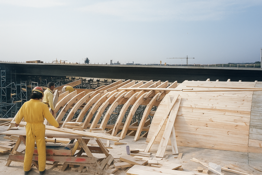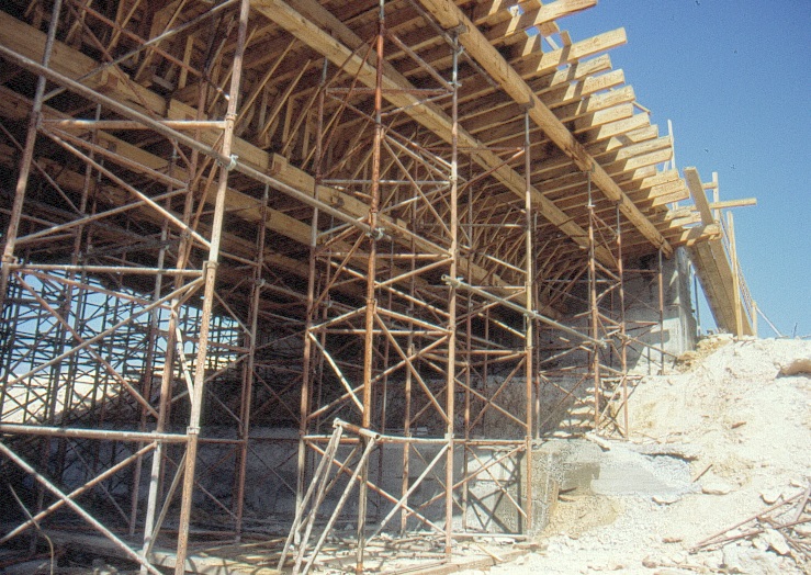 Sobre la cimbra tubular se monta el encofrado de madera, cuyo montaje puede llevar de una a tres semanas: