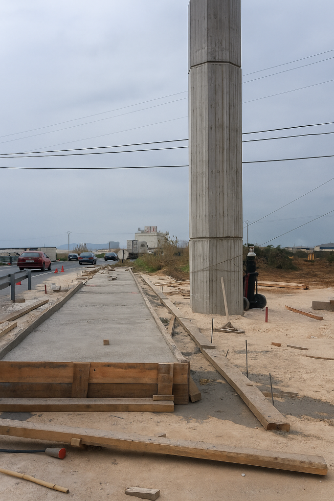 En paralelo, se construyen las pilas intermedias. Un ejemplo común son las pilas circulares, que se ejecutan con encofrados metálicos semicirculares que se ensamblan para formar los diámetros más frecuentes: 1,00 m o 1,20 m.
