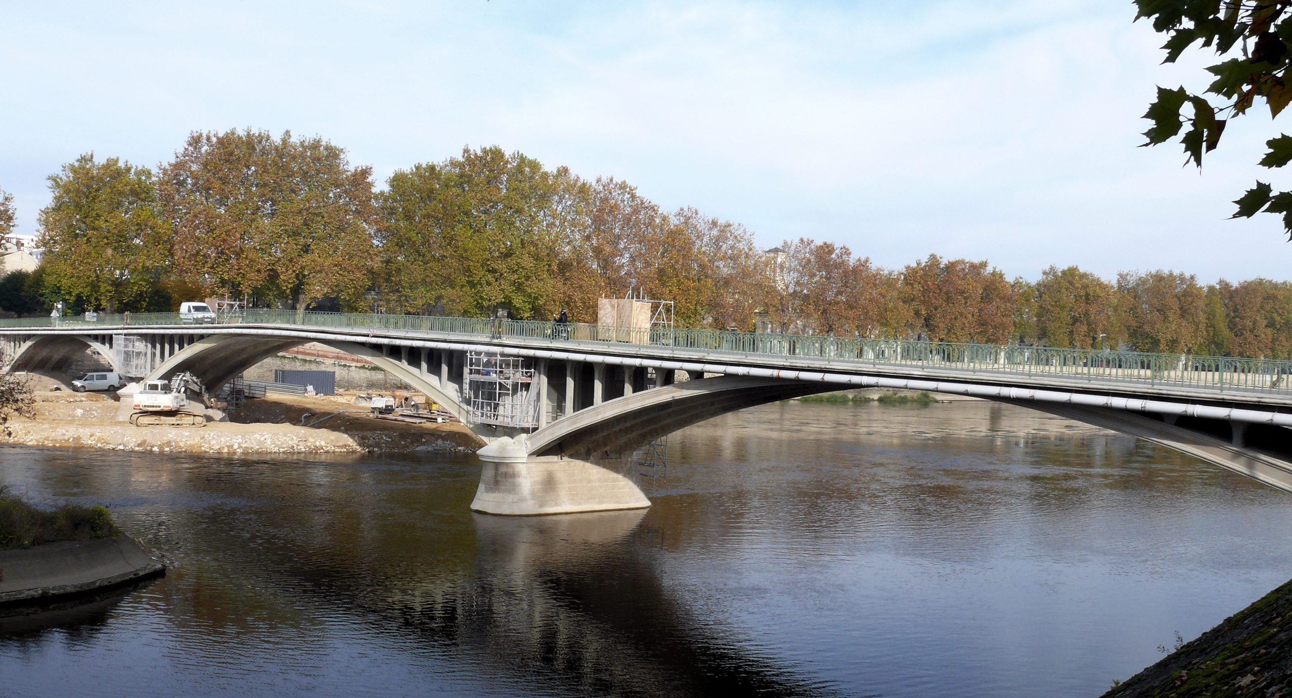 El primer puente de hormigón armado diseñado por Hennebique y la obra más importante de este tipo construida hasta entonces fue el puente Camille de Hogues, erigido entre 1899 y 1900 en Châtellerault sobre el río Vienne. La estructura mide 140 metros de largo y está formada por tres arcos rebajados empotrados; el arco central es el de mayor tamaño y tiene una luz de 50 metros.
