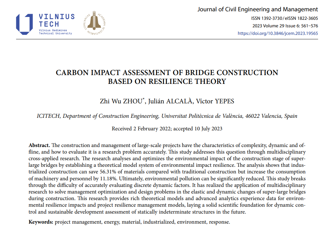 ZHOU, Z.; ALCALÁ, J.; YEPES, V. (2021). Environmental, economic and social impact assessment: study of bridges in China’s five major economic regions. International Journal of Environmental Research and Public Health, 18(1):122. DOI:10.3390/ijerph18010122