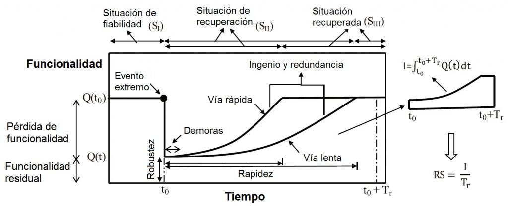 En ingeniería, la resiliencia se define como la capacidad de un sistema de infraestructuras para absorber el impacto de una perturbación, mantener un nivel básico de servicio y recuperarse en un tiempo y con un coste socialmente aceptables. No basta con diseñar estructuras robustas que no se caigan; también es importante que, cuando sufran un daño o una interrupción inevitable, puedan volver a funcionar lo antes posible. A diferencia de la fiabilidad, que mide la probabilidad de que un sistema funcione sin fallos, o de la vulnerabilidad, que estima el grado de daño probable, la resiliencia se centra en el comportamiento del sistema antes, durante y después de la crisis.