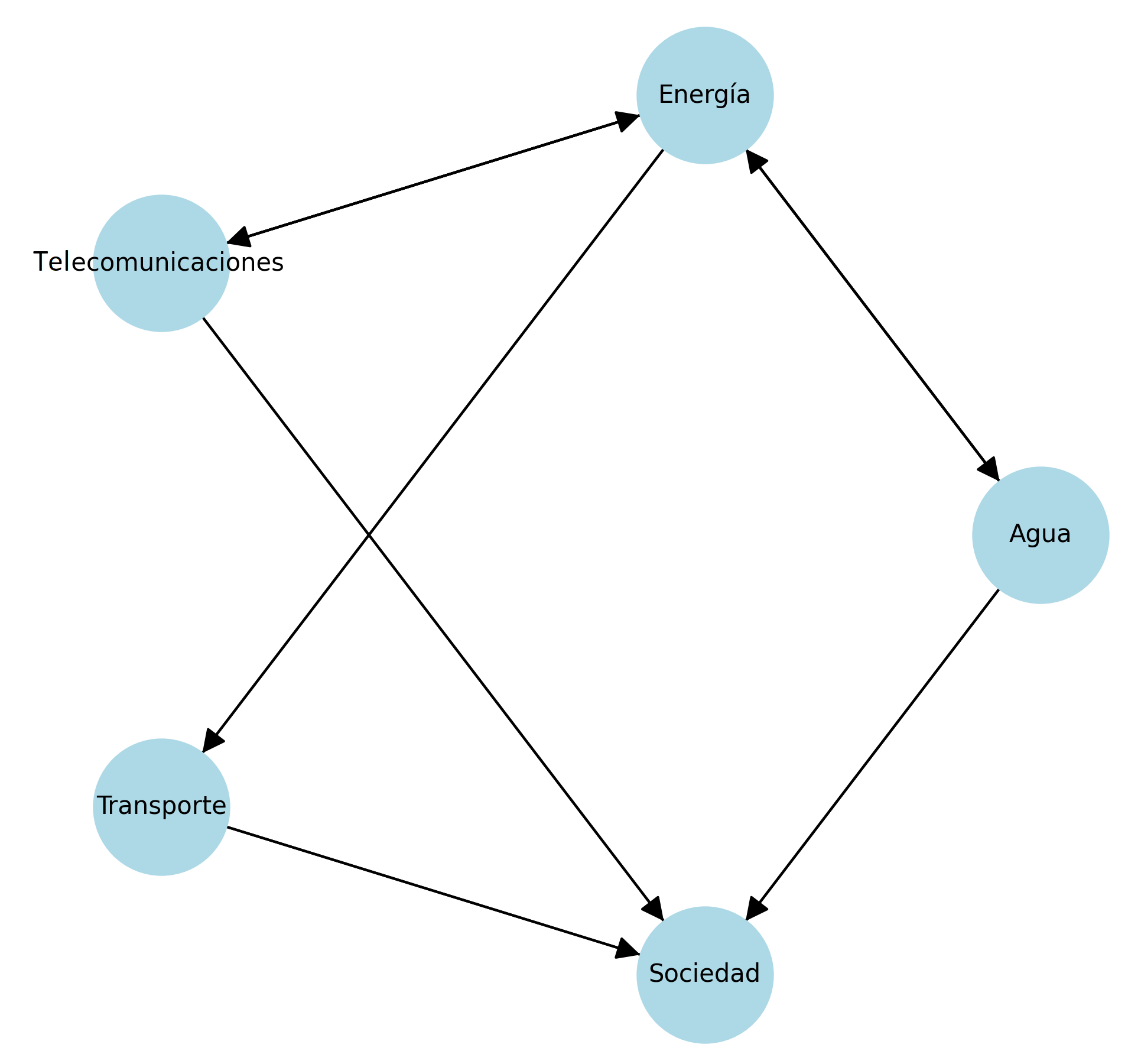 Esquema de interdependencia de infraestructuras críticas: visualiza cómo agua, energía, telecomunicaciones y transporte dependen unas de otras y de la sociedad.