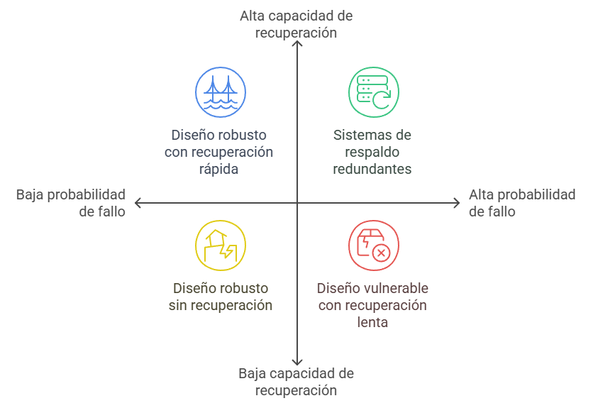 Una de las formas más gráficas de explicar la resiliencia es mediante la curva de funcionalidad, también conocida como «triángulo de resiliencia». Imaginemos una red de suministro eléctrico que opera al 100 % de su capacidad. En el momento en que ocurre un huracán, la funcionalidad del sistema cae en picado, digamos, hasta un 40 %. A partir de ese momento, comienza la recuperación. En algunos casos, la curva puede ser lineal, con una mejora progresiva hasta alcanzar de nuevo el 100 %. En otros, puede presentar una forma exponencial, con una recuperación inicial rápida que se ralentiza al final. También puede ser trigonométrica, comenzando la recuperación lentamente y acelerándose después. El área bajo la curva, es decir, la «superficie» del triángulo de resiliencia, representa la pérdida acumulada de servicio y, por tanto, el coste social del fallo. Esta herramienta permite a los ingenieros comparar estrategias: un sistema con redundancia puede experimentar una caída inicial menor, mientras que otro con mejores recursos de reparación puede recuperarse más rápidamente.