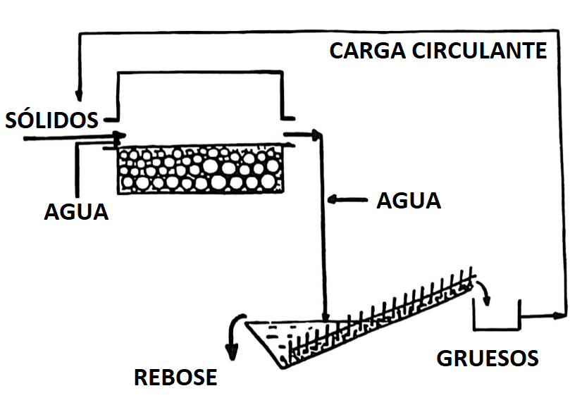 La Figura 1 muestra un esquema de un circuito cerrado que incluye un molino de rebose y un clasificador en espiral o tornillo. Una forma de ajustar el tamaño de corte del clasificador es añadir agua. Este procedimiento modifica la viscosidad de la pulpa, lo que influye en la carga circulante y permite un control más preciso del proceso.