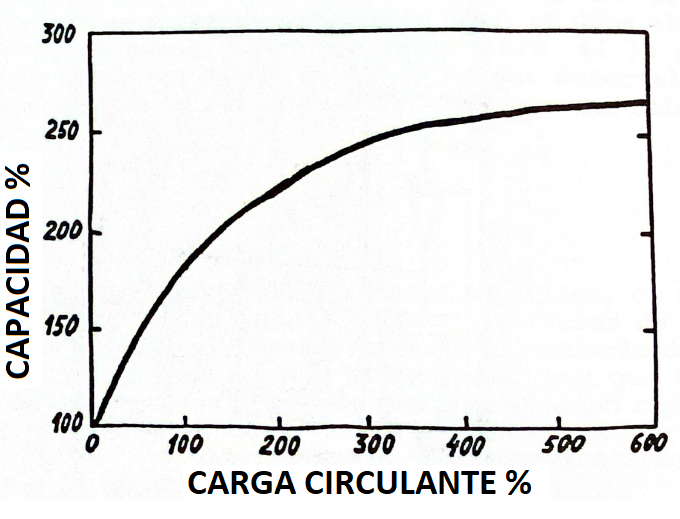 La Figura 3 muestra la variación típica de la capacidad de un molino a medida que aumenta la carga circulante en comparación con un circuito abierto. La carga circulante se expresa comúnmente como un porcentaje en peso del retorno del molino en relación con la nueva alimentación. Un valor del 250 % se considera normal en este contexto.