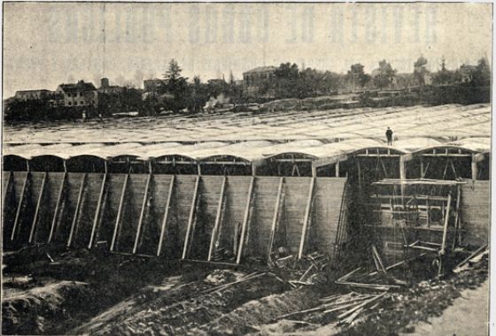Cabe destacar dos obras realizadas en Italia a comienzos del siglo XX: el edificio de silos del puerto de Génova, levantado en 1901, que fue el primero construido en el país con el sistema Hennebique, y el edificio de la Sociedad de Salvamento de Nápoles, construido en 1906. La primera de ellas, y la primera construida en el país con el sistema Hennebique, es el edificio de silos del puerto de Génova, levantado en 1901. Se trata de una obra de gran envergadura propia del ámbito portuario: el edificio mide 500 metros de largo y ocupa una superficie de 15 000 metros cuadrados. Está compuesto por enormes depósitos de grano de sección rectangular y más de 20 metros de altura.