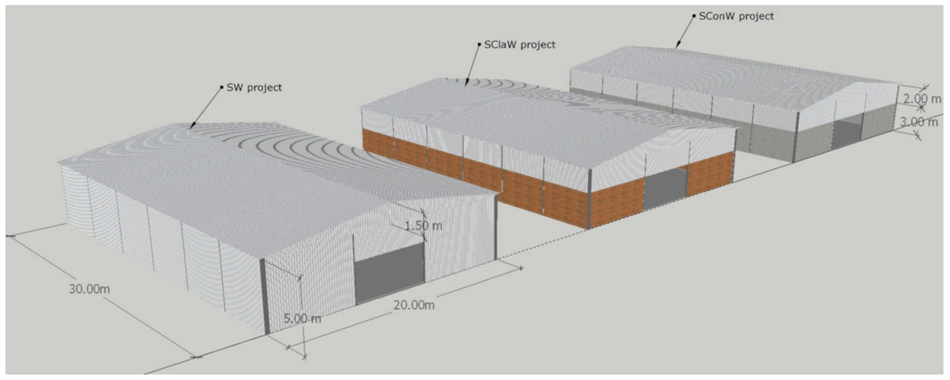 Siguiendo la norma ISO 14040/44, se define el alcance como el ciclo completo de vida de las naves (extracción de materias primas, producción, construcción, uso y fin de vida). La unidad funcional elegida es 500 m² de cerramiento lateral equivalente a la envolvente de dos muros completos de la nave (superficie total: 600 m², 30 m × 20 m × 5 m). Se excluyó el tratamiento de los residuos generados en la obra y en el mantenimiento por falta de datos fiables y para garantizar la comparabilidad entre los tres diseños.