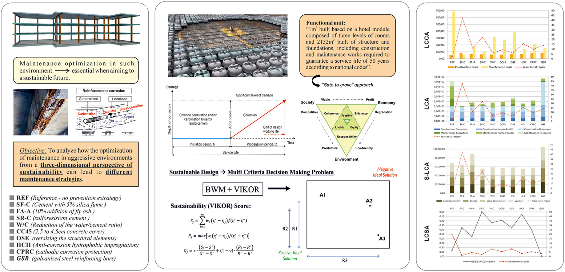 El estudio emplea un marco metodológico triple para evaluar y comparar exhaustivamente los sistemas de losas. El análisis abarca «de la cuna a la tumba» y la unidad funcional se define como 1 m² de losa diseñada para 50 años de servicio.
