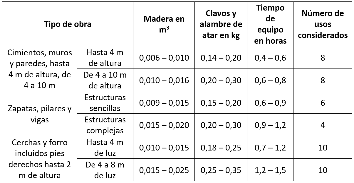 En la Tabla 1 se especifican, de forma indicativa, los usos de la madera, su utilidad y los kilogramos de clavos y ataduras según el tipo de encofrado. En la estimación de costos, se aconseja distinguir entre la madera de tabla y largueros y la de puntales, siendo esta última más económica. El costo de la madera debe incrementarse en un rango del 10 al 20 % para cubrir pérdidas, recortes y cuñas.