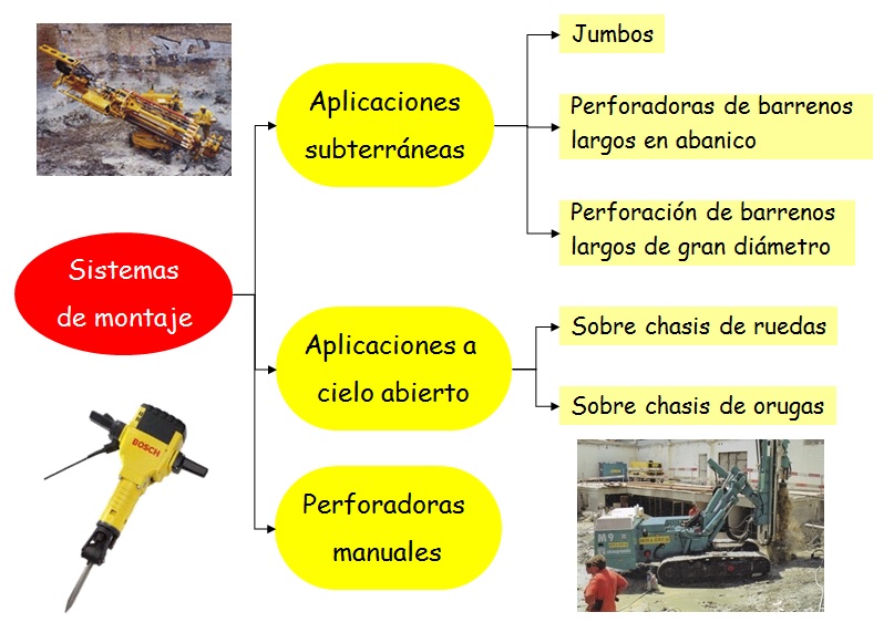 Perforadoras con martillo en cabeza, que a su vez pueden ser de accionamiento neumático o hidráulico. Aquí la rotación y la percusión se producen fuera del barreno, transmitiéndose a través de una espiga y del varillaje hasta la boca de perforación.