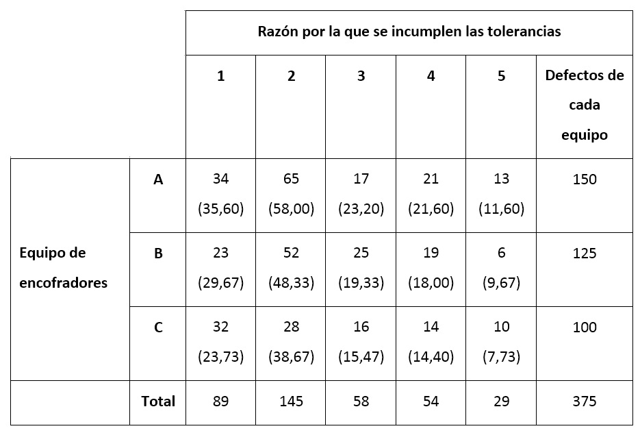 En la Figura 2 se ha representado también la frecuencia esperada para cada uno de los casos. Por ejemplo, la fracción esperada del incumplimiento «1» es de 89/375, mientras que la fracción esperada de defectos del equipo A es de 150/375. Ello implica que el valor esperado de incumplimientos del tipo «1» para el equipo de encofradores «A» sería: (89/375)·(150/375)·375=89·150/375=35,60.