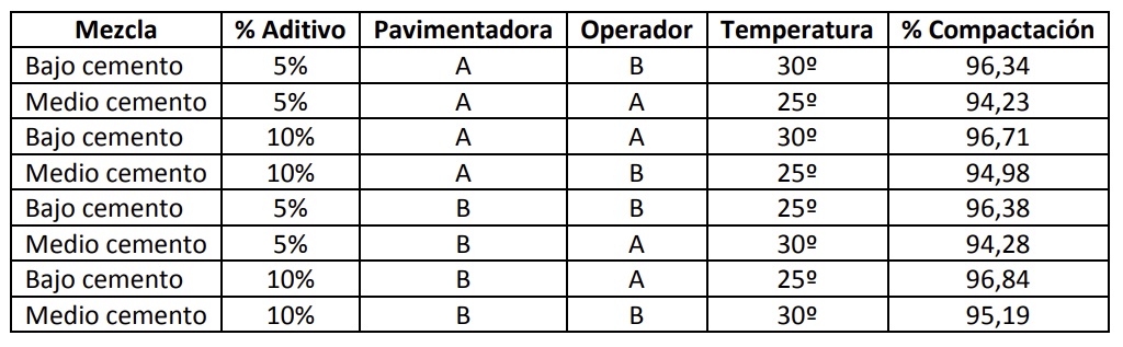 Se quiere determinar la mejor forma de elaborar hormigón compactado con una pavimentadora. La variable de respuesta es el porcentaje de compactación, medido con un densímetro nuclear. Tras una tormenta de ideas con expertos, se ha realizado un diseño de experimentos con 5 factores: el porcentaje de aditivo, la pavimentadora (A antigua, B moderna), el operador de la pavimentadora (A con poca experiencia, y B con mucha), el tipo de mezcla de hormigón y la temperatura del hormigón. Se ha tenido que realizar un diseño fraccionado puesto que el presupuesto limita el número de experimentos a un máximo de 12. Se pide que se analicen los resultados, que fueron los de la tabla siguiente: