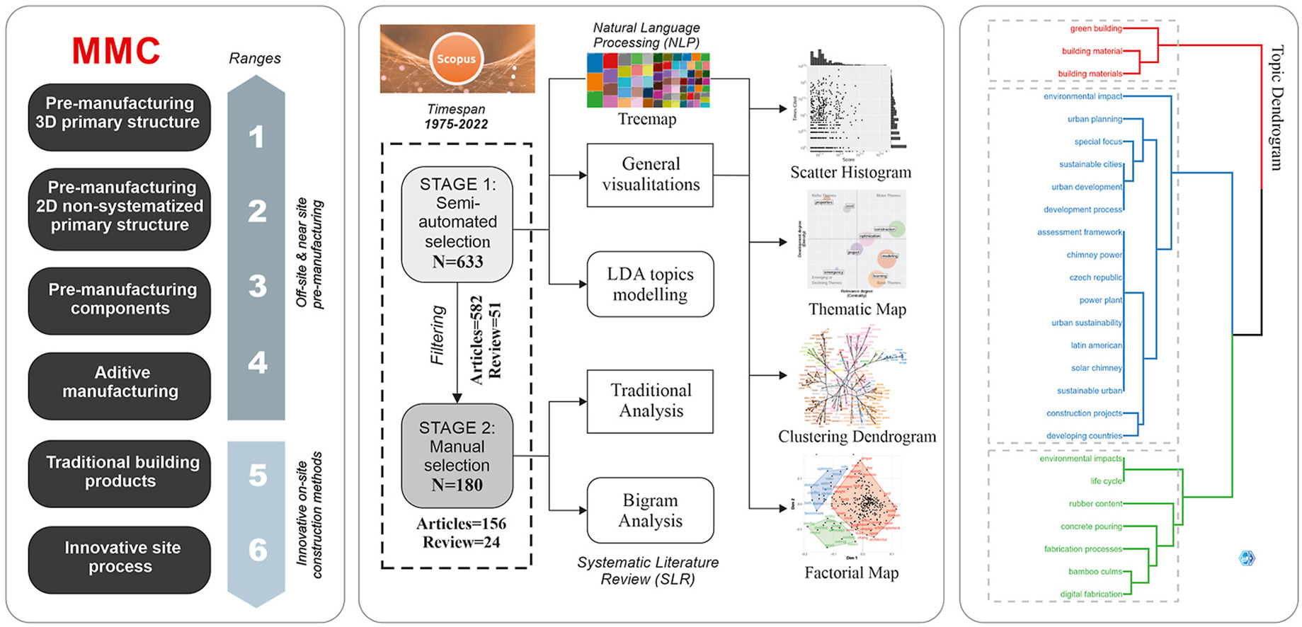 - Construcción/fabricación en taller (OSC/OSM): (del inglés, Off-Site Construction/Manufacturing) se refiere a la ubicación. Su función principal es indicar que una parte o la totalidad del proceso de construcción se traslada de la obra a un entorno controlado, como una fábrica. Sin embargo, el término no especifica nada sobre el sistema de producción subyacente. La investigación en este campo suele centrarse en las interfaces entre la fábrica y la obra, las restricciones de transporte y la secuencia de instalación, pero rara vez aborda los principios de fabricación o la integración digital que definen un sistema de producción completo.