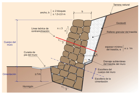 El geotextil es un material textil plano, permeable, deformable, formado por fibras poliméricas. Su función es la de refuerzo, trabajando a tracción, además de evacuar el agua. Se introduce una longitud mínima de anclaje para evitar deslizamientos (Figura 2). El refuerzo se introduce junto con el relleno en capas de unos 50 cm, coincidiendo con el espesor del terraplenado. Son muros económicos y fáciles de construir. Presentan una gran flexibilidad y deformación. Además, la capa de geotextil puede convertirse en una superficie débil que favorezca los desplazamientos. Otro inconveniente es la susceptibilidad del geotextil a componerse ante la luz solar. A menudo se hidrosiembra el paramento visto para formar un muro vegetalizado (Figura 2).