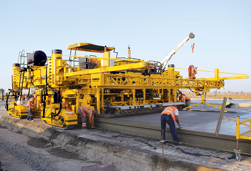 Las pavimentadoras de encofrado deslizante realizan la distribución, vibrado y terminación del hormigón en una sola pasada, y para dotarle de textura y curado posterior se utiliza un carro con dispositivos especiales. La cota y la rasante del pavimento se determinan mediante palpadores que se apoyan en hilos tensos o en sistemas de guiado tridimensional.