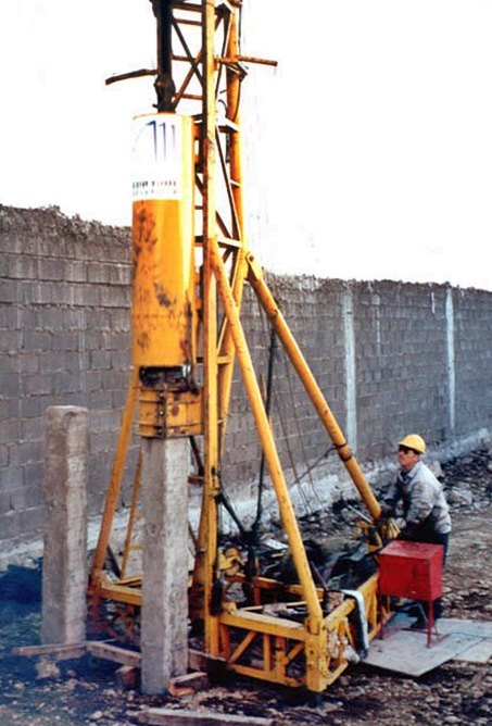 Hinca por vibración. Unos equipos denominados vibrohincadores. Su uso está prácticamente limitado a la hinca de perfiles metálicos, tanto de pilotes como de tablestacas.