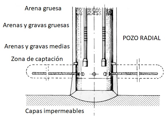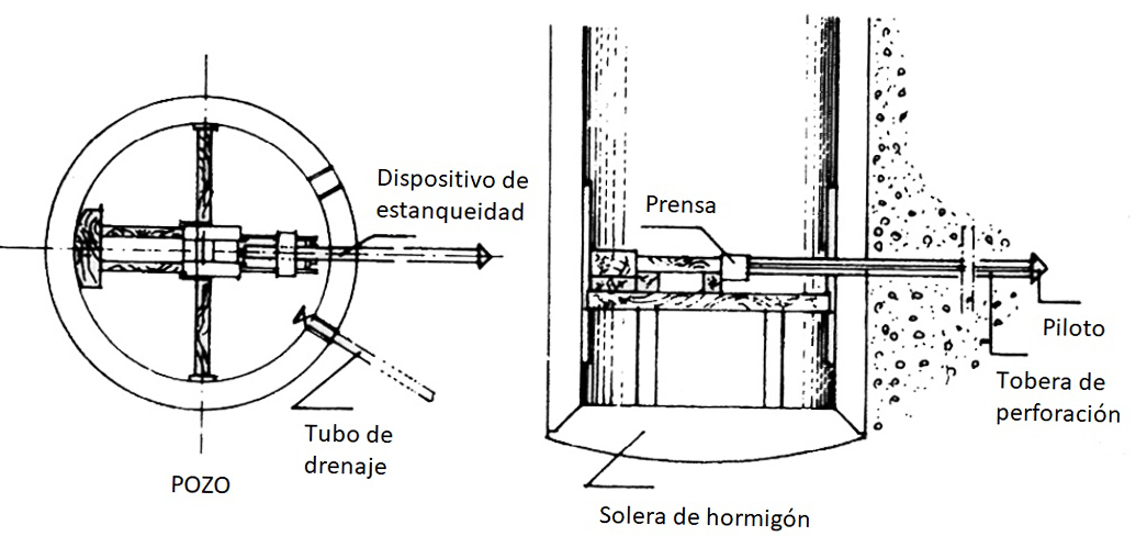 - Estructura del pozo: el anillo inferior es de acero biselado, permitiendo que los anillos de hormigón se deslicen a medida que avanza la excavación. Los anillos prefabricados de hormigón se añaden desde la superficie y son empujados por cilindros hidráulicos (3 o 4 unidades habituales), conectados a través de cables de acero que soportan el peso total de la estructura.