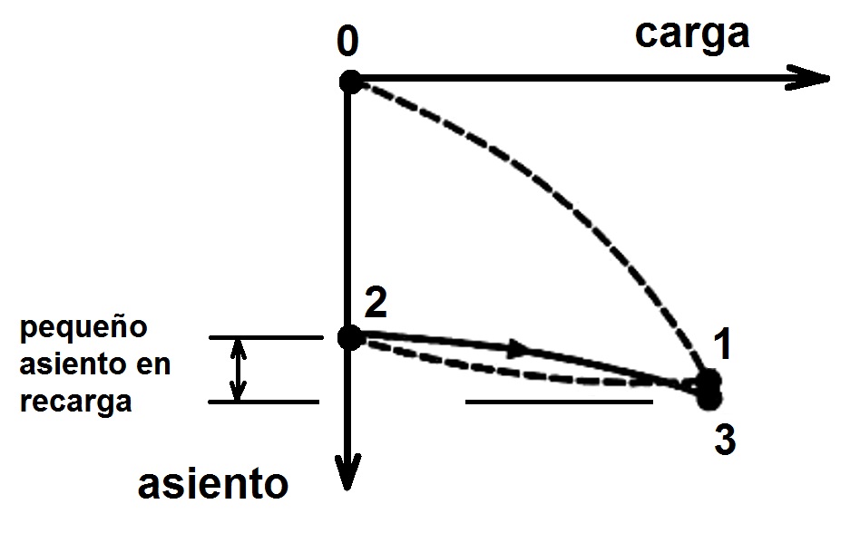 La Figura 1 muestra la curva de asientos de un suelo precargado bajo un terraplén. Durante la precarga, el suelo asienta según la curva descrita hasta llegar al punto 1, correspondiente al instante en que se retira el terraplén. Así, la curva describe esta descarga hasta llegar al punto 2, donde el suelo ya no tiene carga, pero los asientos remanentes son casi iguales a los producidos por la carga del terraplén.