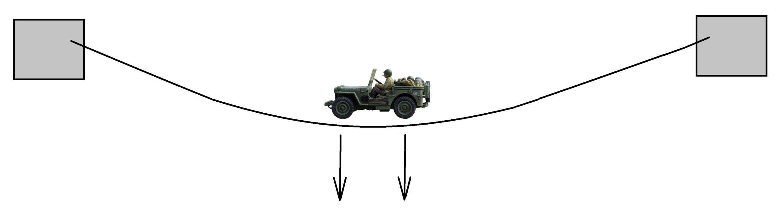 Andaba estudiando 4º curso de la carrera de ingenieros de caminos, canales y puertos de Valencia, cuando en la asignatura de Procedimientos Generales de Construcción y Organización de Obras, el profesor Hermelando Corbí nos explicaba problemas de cables. Uno de dichos problemas lo he rescatado de mis viejos apuntes. Trata de un jeep que tiene que pasar por un puente militar formado por un cable. ¡Quién sabe cómo puede viajar un jeep por un solo cable! Pero bueno, el problema era el que era y había que resolverlo.