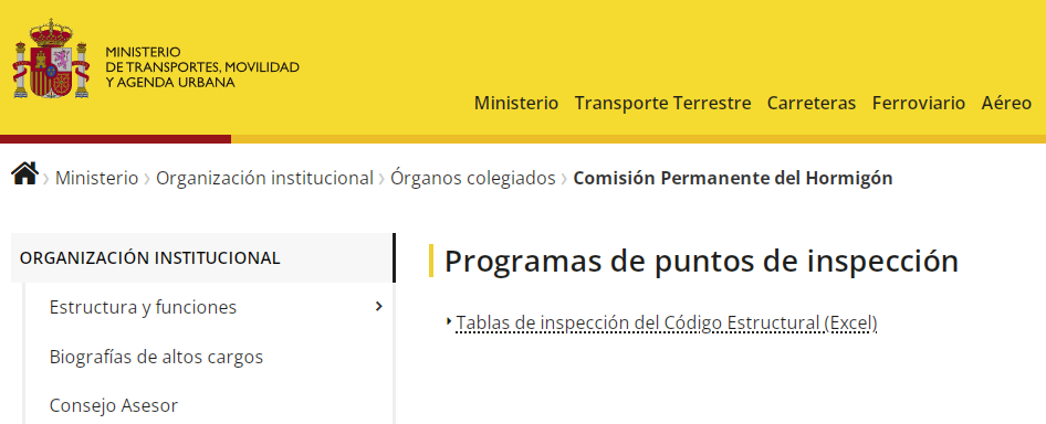 En una de las entradas de mi blog de las que hablaba del Programa de Puntos de Inspección del Código Estructural (PPIs), se decía que el Ministerio de Transportes, Movilidad y Agenda Urbana incluiría un enlace donde se puede acceder a unas tablas editables para la elaboración de los PPIs. Se trata de una tabla Excel editable donde aparecen las unidades de inspección y frecuencia de comprobación por lote de control de ejecución, tanto para el acero como para el hormigón. Ya los tenéis en el siguiente enlace: