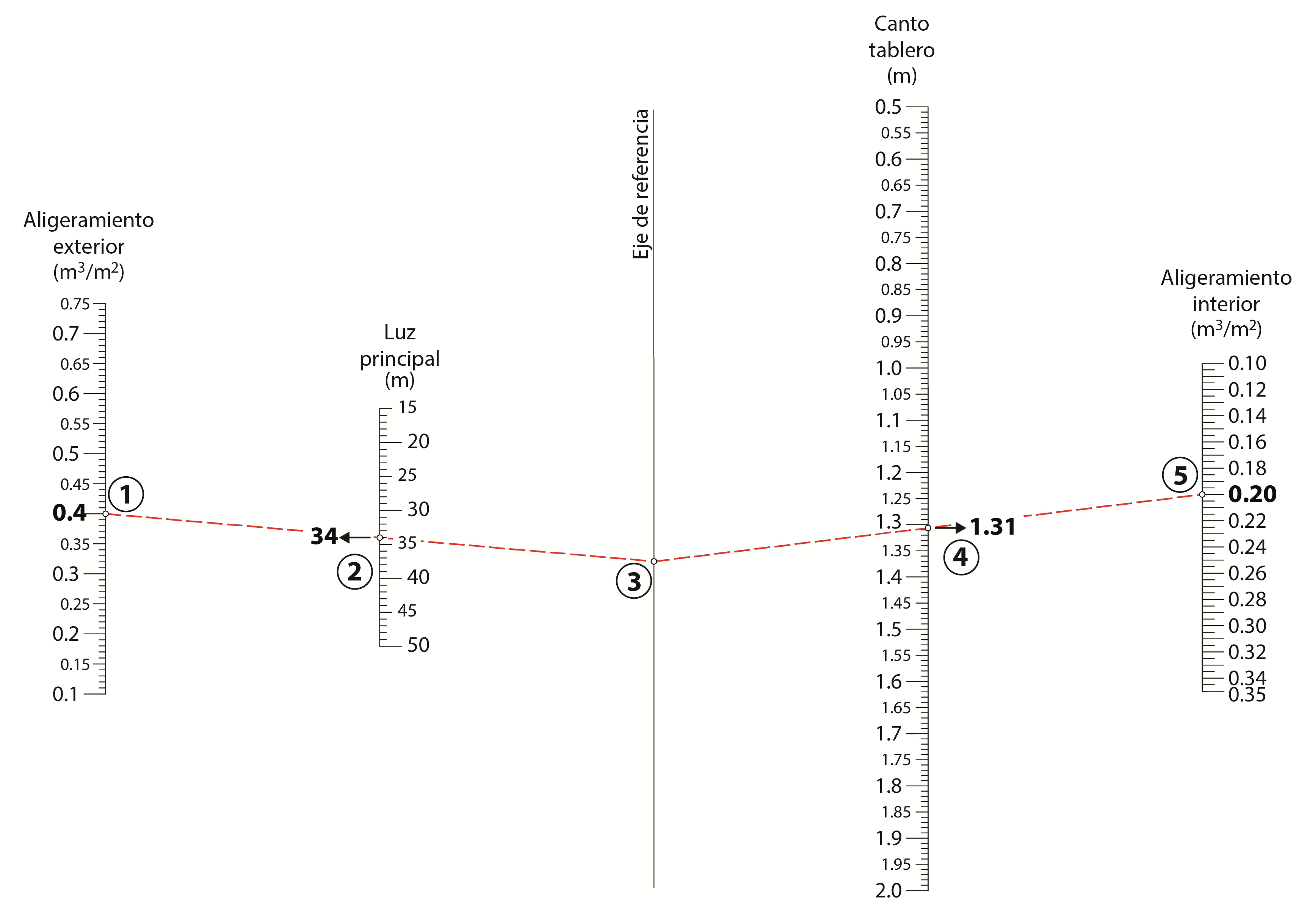 - Relación canto/luz: La esbeltez del tablero es un indicador clave de su eficiencia. Esta relación se obtiene dividiendo el canto entre la distancia entre apoyos (luz). Por lo general, esta proporción es de aproximadamente 1/25, aunque puede llegar a un límite práctico de 1/30 cuando existen restricciones severas de gálibo vertical. Superar este umbral conduce a diseños que requieren un pretensado excesivo, lo que invalida la eficiencia del concepto estructural y obliga a replantear el diseño por completo.