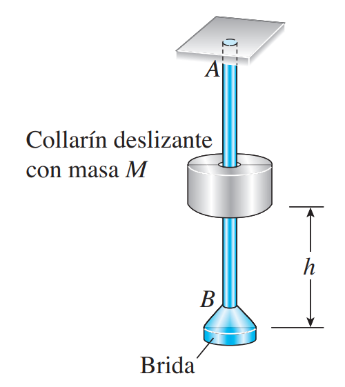 Ignoraremos todas las pérdidas de energía y supondremos que toda la energía cinética del collarín al caer se transforma por completo en energía de deformación de la barra. Esta simplificación da como resultado esfuerzos mayores de los que realmente se producirían si se tuvieran en cuenta las pérdidas de energía.