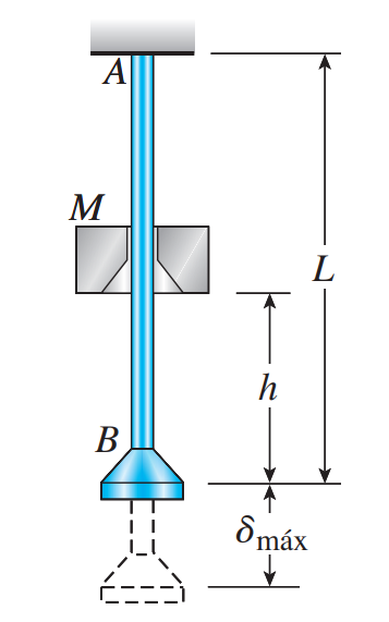 Con estas suposiciones, podemos calcular el alargamiento máximo de la barra y los esfuerzos de tensión máximos producidos por la carga de impacto. Hay que recordar que en este análisis no se tiene en cuenta el peso de la barra y que únicamente se evalúan los esfuerzos generados por la caída del collarín.