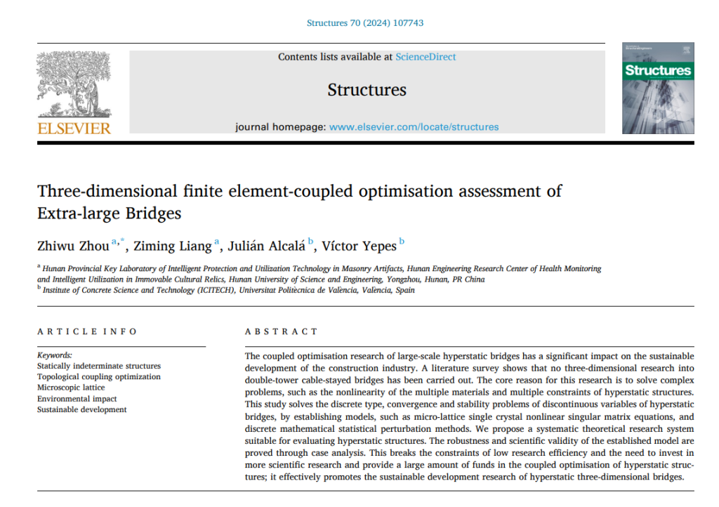 ZHOU, Z.; LIANG, Z.; ALCALÁ, J.; YEPES, V. (2024). Three-dimensional finite element coupled optimization assessment of extra-large bridges. Structures, 70:107743. DOI:10.1016/j.istruc.2024.107743