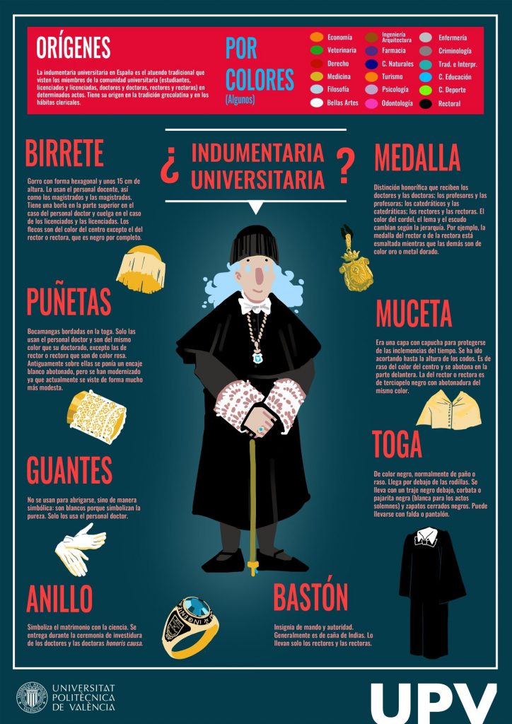 En ocasiones nos hemos preguntado el significado de la indumentaria universitaria, especialmente cuando los miembros de la comunidad universitaria (estudiantes, licendiados, doctores y rectores) la usan en determinados actos académicos. Esta indumentaria tiene su origen en la tradición grecolatina y en los hábitos clericales. Os paso una infografía de la Universitat Politècnica de València donde se explica cada uno de los elementos de la vestimenta.