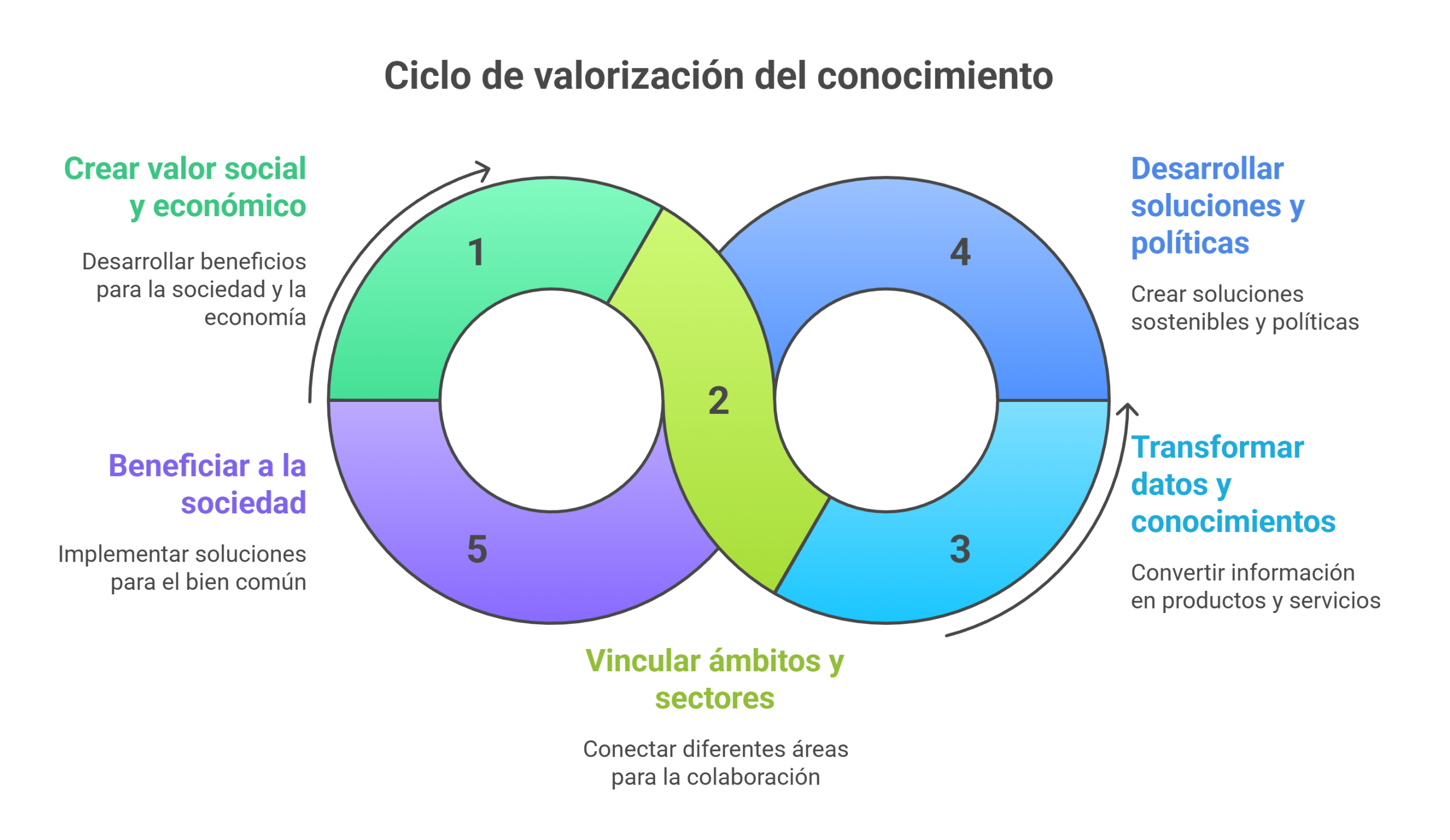 La valorización del conocimiento consiste en crear valor social y económico a partir de él, vinculando diferentes ámbitos y sectores, y transformando datos, conocimientos técnicos y resultados de la investigación en productos, servicios, soluciones y políticas basadas en el conocimiento, sostenibles y que beneficien a la sociedad.