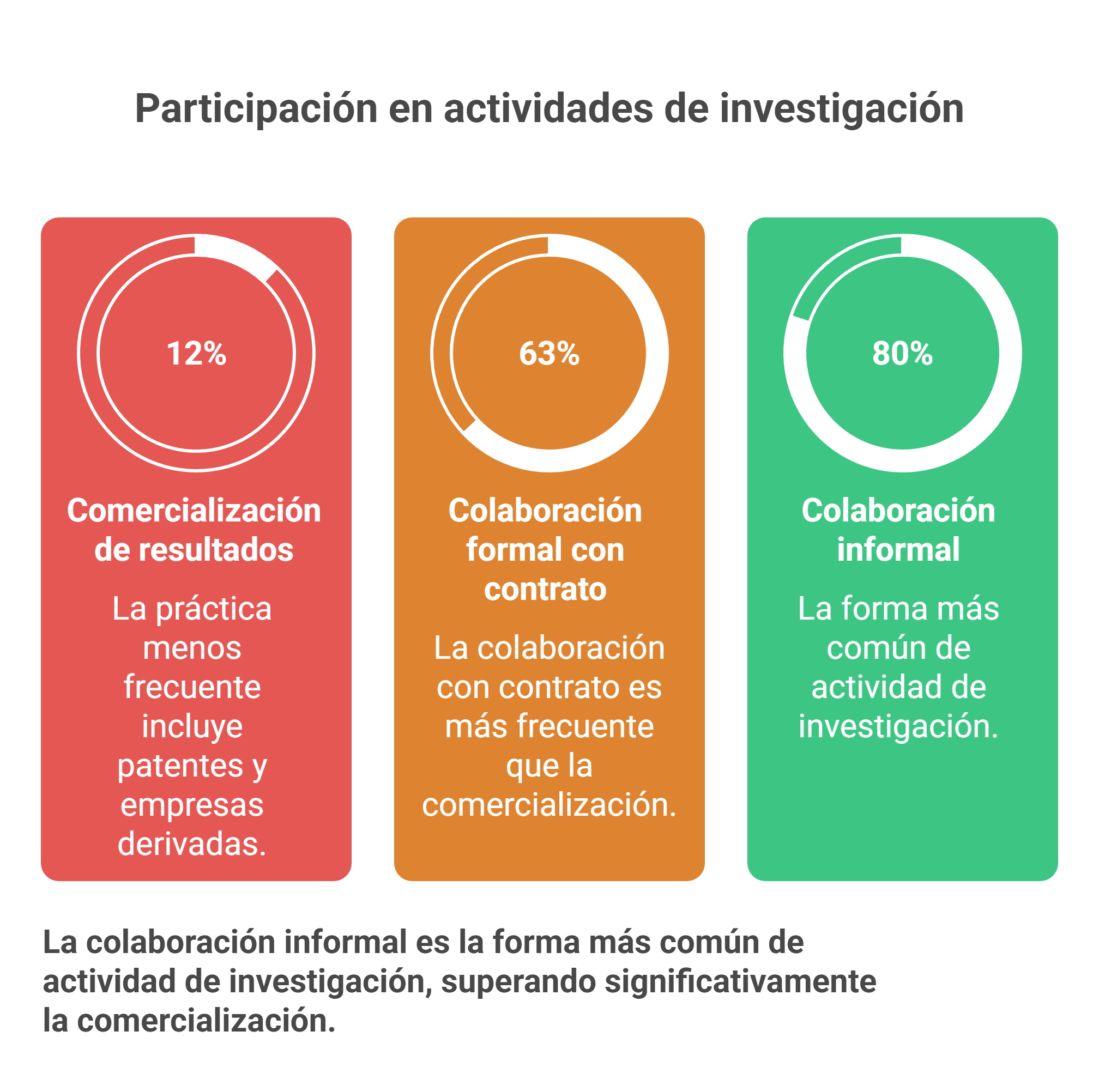 Sin embargo, la realidad es muy diferente. El informe de la ANECA pone de manifiesto que solo una minoría de investigadores e instituciones participa activamente en estas actividades. Los datos del estudio EXTRA son reveladores: la comercialización de resultados (que incluye patentes y empresas derivadas) es una práctica mucho menos frecuente (12 %) que la colaboración formal mediante contrato (63 %) o la colaboración informal (80 %). Esto significa que, durante décadas, los sistemas de evaluación han premiado y medido la actividad de una minoría (el 12 %), mientras que el vasto ecosistema de colaboración real (el 80 %) que genera valor social ha permanecido en la sombra, sin ser reconocido ni incentivado.