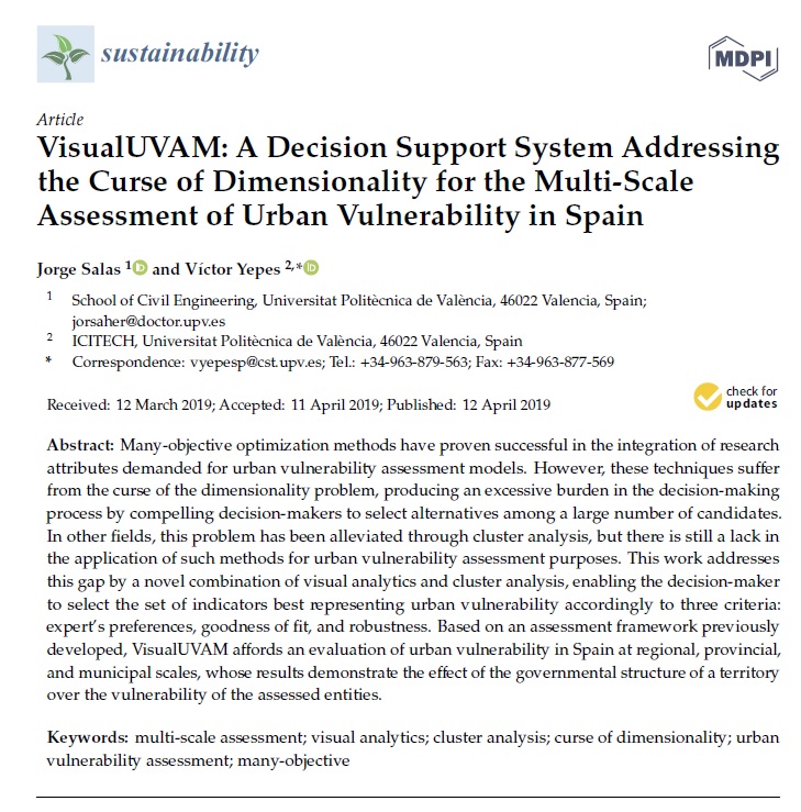 SALAS, J.; YEPES, V. (2018). Urban vulnerability assessment: Advances from the strategic planning outlook. Journal of Cleaner Production, 179:544-558. DOI:10.1016/j.jclepro.2018.01.088