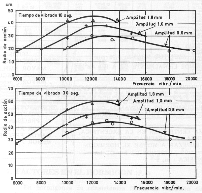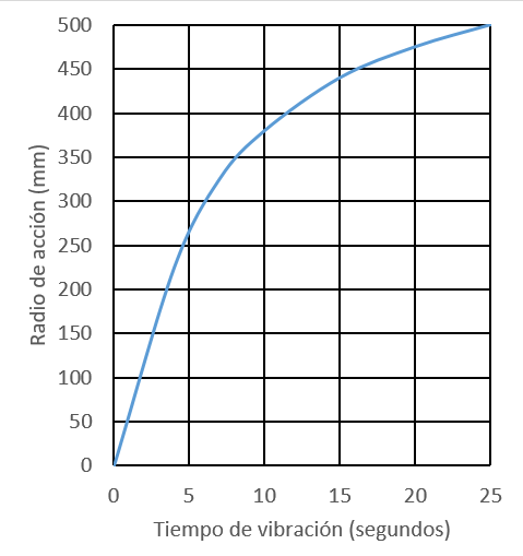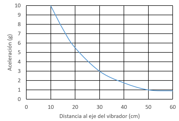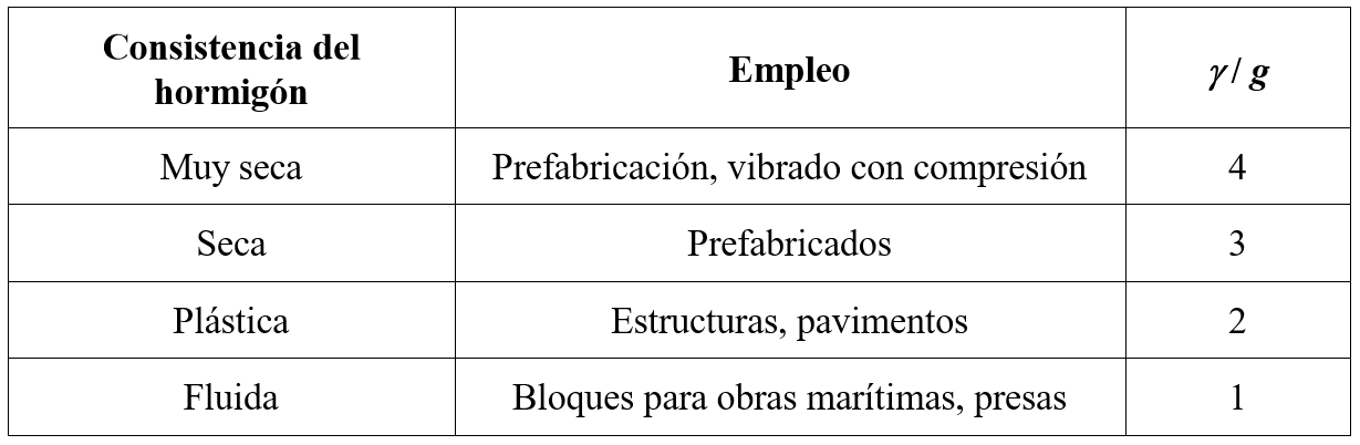 Según Tiktin (1998), se aconseja una relación γ/g de 5 para una consistencia húmeda y de 1 a 2 para una consistencia plástica a seca. Al aumentar el valor de la aceleración, se consigue una compactación más rápida. Esto confirma la necesidad de ajustar los parámetros de vibración según la consistencia del hormigón para evitar la segregación.