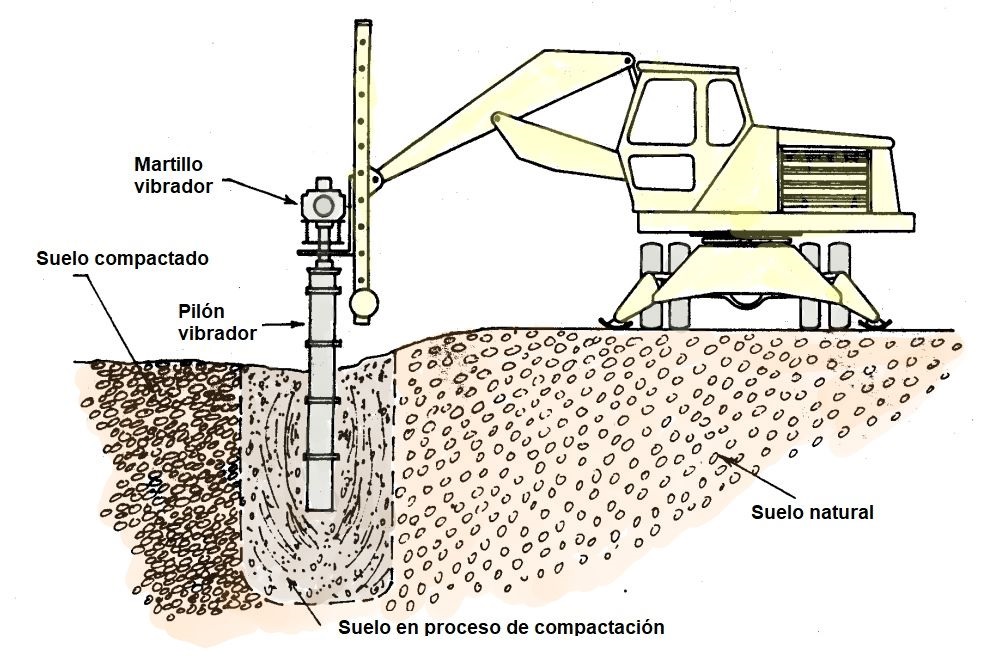 Se utilizan vibradores específicos de baja frecuencia, colgados de grúas. El vibrador se introduce en el terreno por acción de su propio peso, aunque es habitual el uso de agua a presión para facilitar el hincado. Se genera de este modo una licuación localizada que permite una rápida reordenación y un asiento casi inmediato. Este flujo de agua estabiliza las paredes del agujero y refrigeran el motor del vibrador. La compactación se realiza por pasadas sucesivas, de abajo hacia arriba. Se densifica un cilindro de unos 2 a 5 m de diámetro, dependiendo del tipo de suelo.