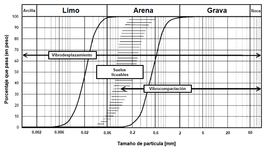 Una forma de mejorar los terrenos consiste en introducir un vibrador en el terreno para conseguir su densificación, es lo que se conoce como vibración profunda. Si el terreno es poco cohesivo (un contenido de finos inferior al 10% – 15%), dicha técnica se denomina vibrocompactación o también vibroflotación. En la Figura 1 se observa la aplicabilidad de la vibrocompactación.